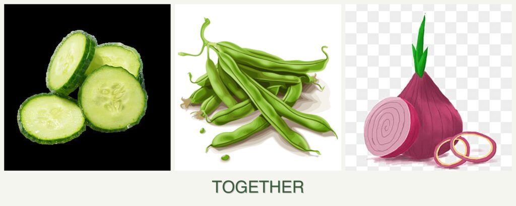- Growth Requirements: Cucumbers and beans both thrive in similar conditions: full sun, well-drained soil, and regular watering. Onions prefer slightly cooler conditions and can tolerate partial shade.