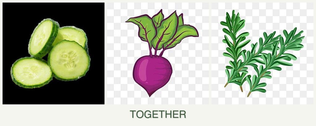 Rosemary’s strong scent repels certain pests that might otherwise target cucumbers and beets. Additionally, beets can help break up the soil, improving conditions for cucumbers. However, be mindful of spacing and nutrient competition, as cucumbers are heavy feeders.