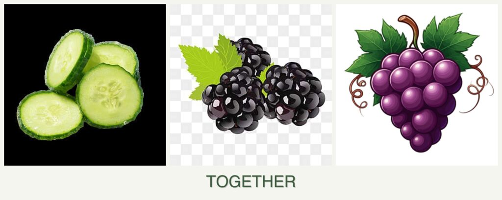 - Pest Repellent Properties: While cucumbers, blackberries, and grapes do not inherently repel each other’s pests, interplanting with herbs like basil and mint can offer natural pest deterrence.