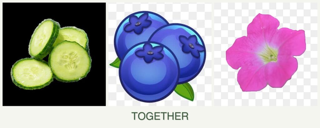 - Pollinator Attraction: Petunias attract pollinators, which can benefit cucumbers and blueberries.