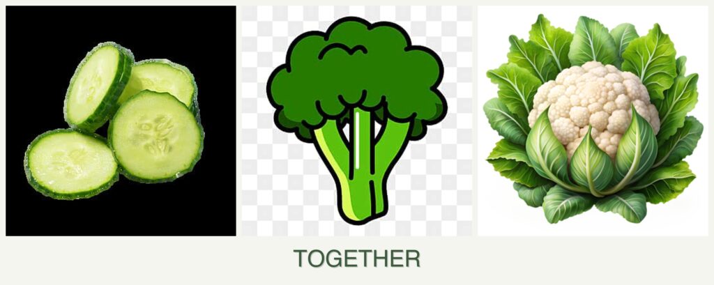 - Spacing: Cucumbers spread out and climb, while broccoli and cauliflower grow upright, potentially leading to overcrowding.