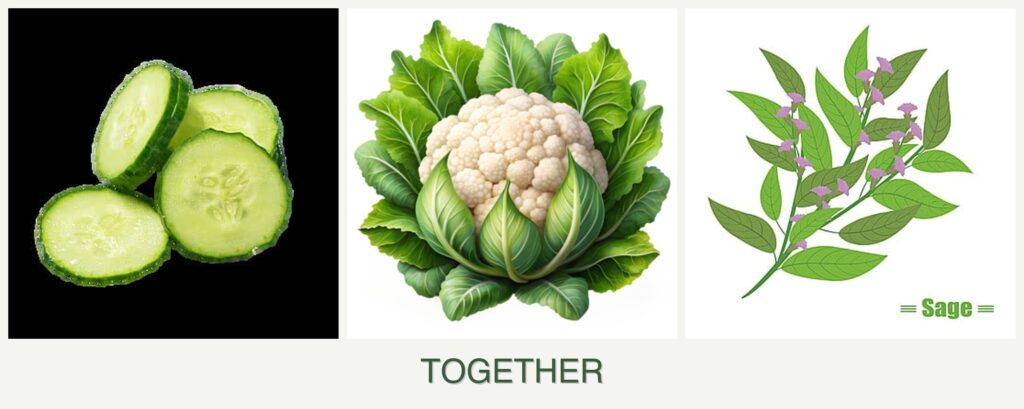 The short answer is: Yes, you can plant cucumbers, cauliflower, and sage together, but with some considerations.