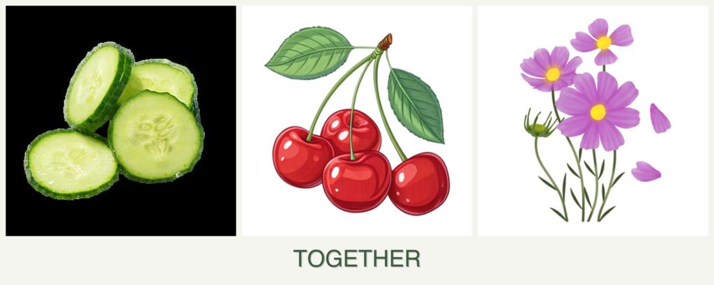 Cherries and Cucumbers/Cosmos: Cherries, being trees, have different requirements. They need more space and have deeper roots, which can compete with cucumbers. Cosmos, being a flower, doesn’t directly compete but may not thrive under the shade of a cherry tree.