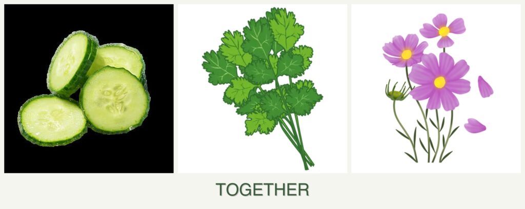 Planting cucumbers, cilantro, and cosmos together offers several advantages: