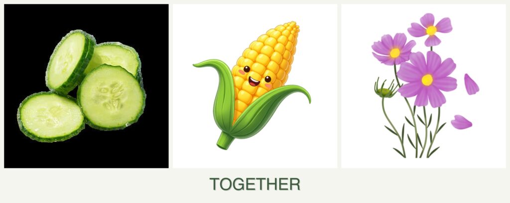 - Competition for Resources: Corn’s high nutrient demand can outcompete cucumbers and cosmos if not managed properly.