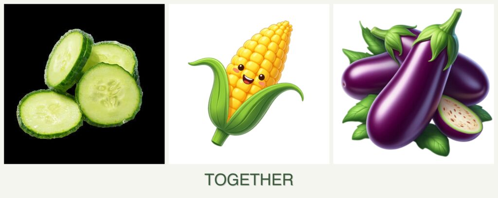 Planting cucumbers, corn, and eggplant together can offer several advantages: