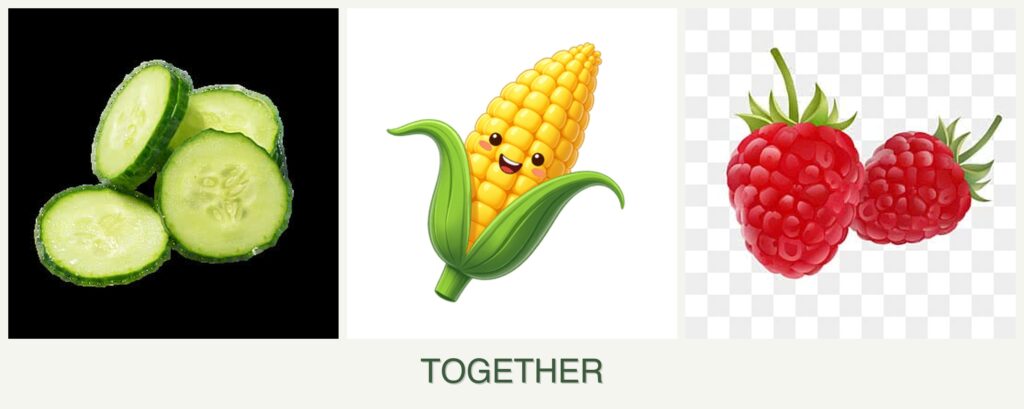 - Growth Requirements: Cucumbers and corn share similar sunlight and soil needs, while raspberries prefer slightly acidic soil and consistent moisture.