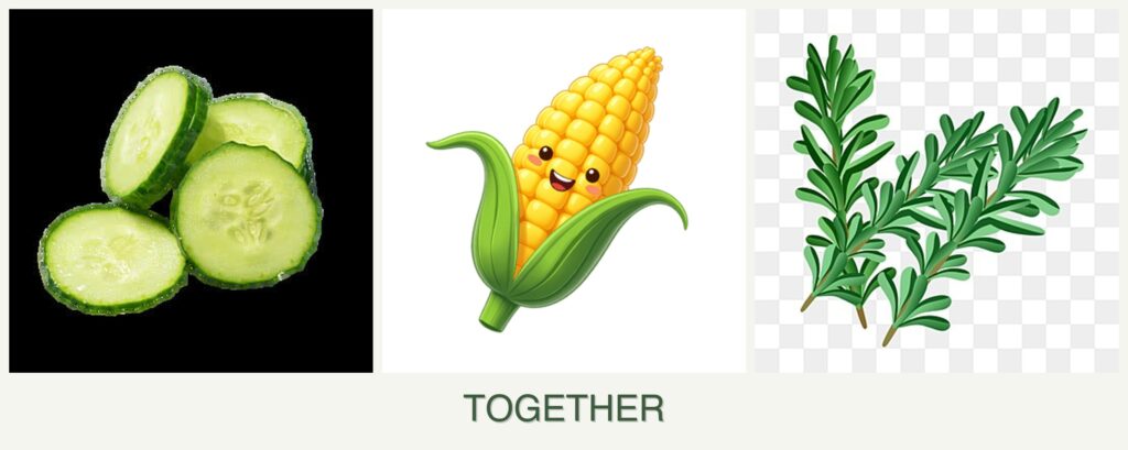 - Growth Requirements: Cucumbers and corn share similar sunlight and soil needs, while rosemary’s preferences differ.