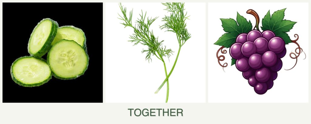 - Pest Control: Dill helps deter pests from cucumbers, while grapes do not offer significant pest control benefits to the other two.