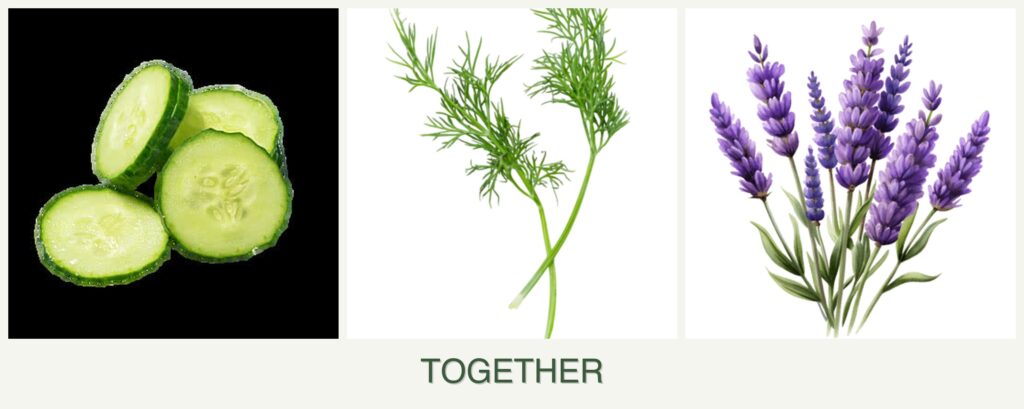 Nutrient Needs & Spacing: Cucumbers and dill have similar nutrient needs, but lavender’s requirements differ. Proper spacing is crucial to ensure each plant receives adequate resources.