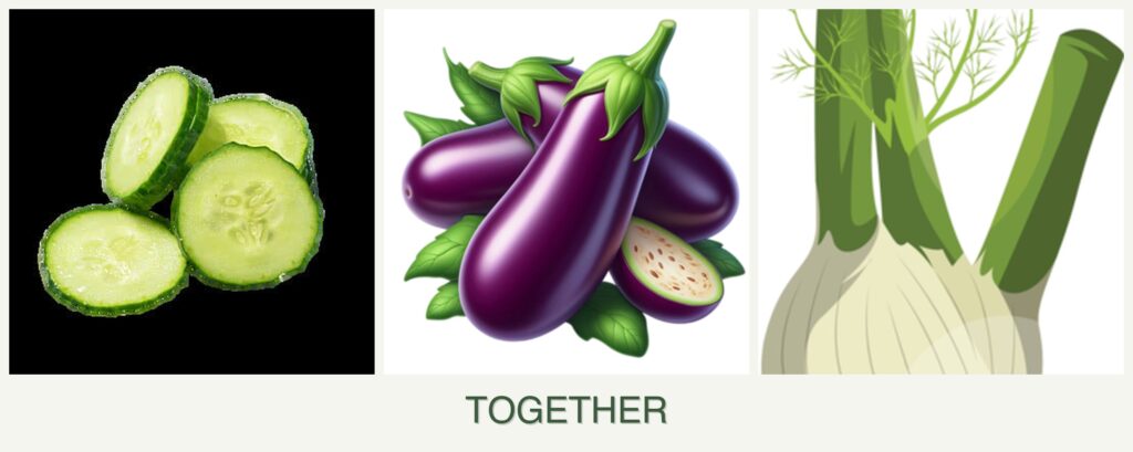 - Growth Requirements: Cucumbers and eggplants thrive in similar conditions—warm temperatures and full sun—while fennel can adapt but often competes for resources.