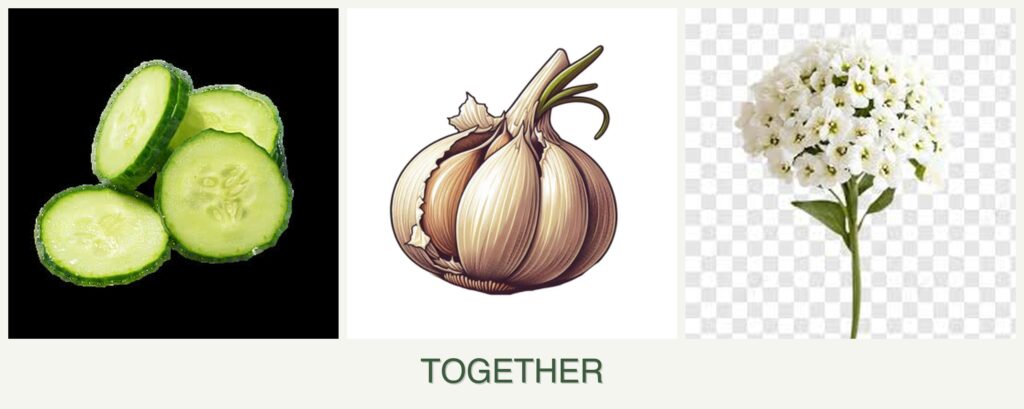 - Watering Needs: Cucumbers need consistent moisture, while garlic and alyssum are more drought-tolerant. Adjust watering to meet each plant’s needs.
