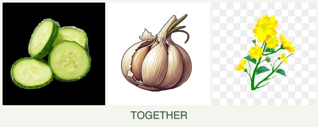 - Pest Control: Garlic acts as a natural pest deterrent, protecting cucumbers from aphids and beetles. Calendula attracts beneficial insects that prey on garden pests.