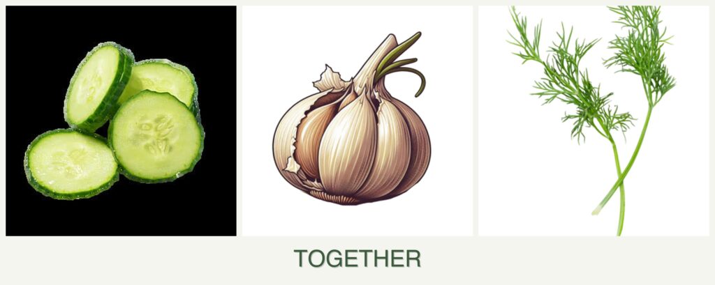 Growth Requirements: Cucumbers require full sun and ample water, while garlic prefers well-drained soil. Dill thrives in similar conditions to cucumbers, making them compatible.