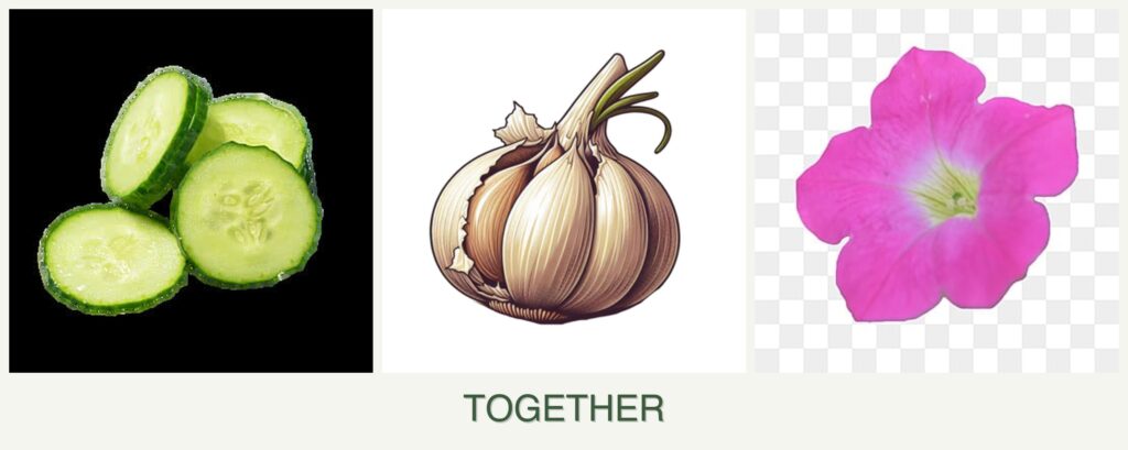 Planting cucumbers, garlic, and petunias together can offer several benefits: