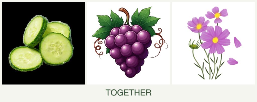 - Growth Requirements: Cucumbers and grapes both require full sun, while cosmos can tolerate partial shade. All three need well-drained soil.