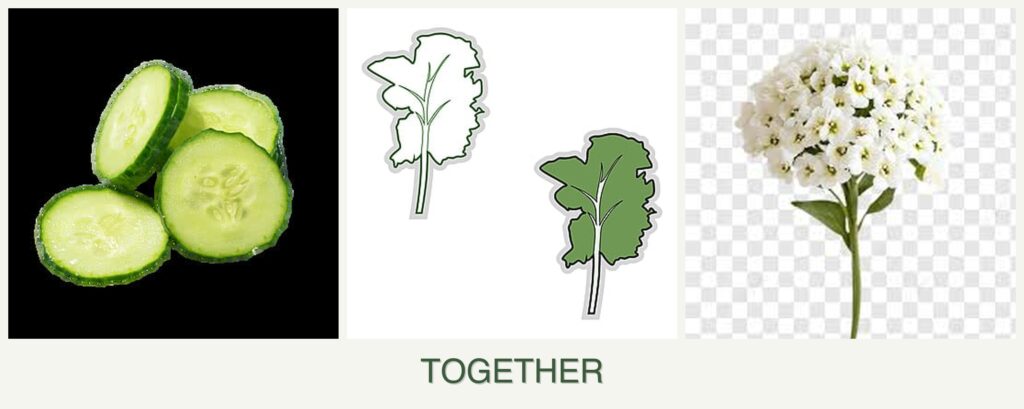 Growth Requirements: Cucumbers thrive in full sun, while kale can tolerate partial shade, making them compatible in terms of light needs. Alyssum, known for its low-growing habit, can serve as a living mulch to retain moisture and suppress weeds around the taller cucumber and kale plants.