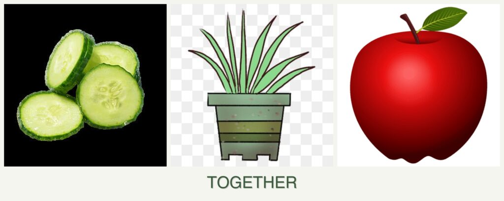 Growth Requirements: Cucumbers and lemongrass share similar needs for warm temperatures and full sun, making them compatible in terms of growing conditions. Apples, however, being a tree, have different space and nutrient requirements.