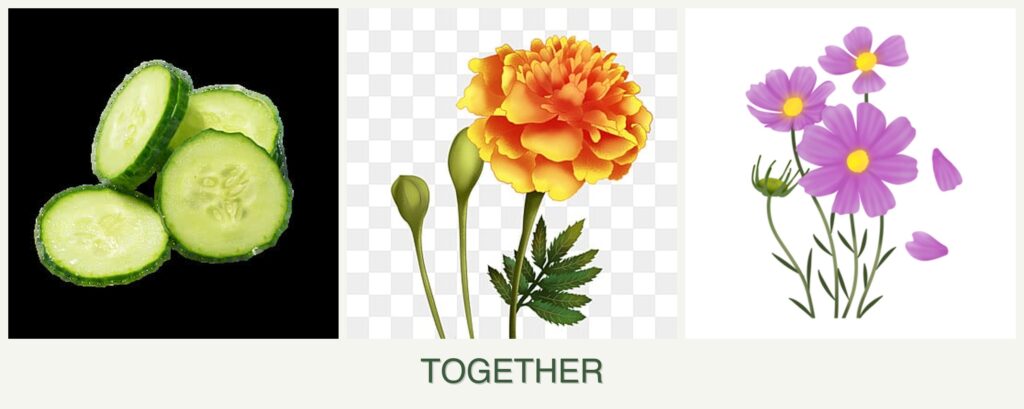 - Harvesting Considerations: Ensure cucumber vines do not overtake marigolds or cosmos, making harvesting difficult.