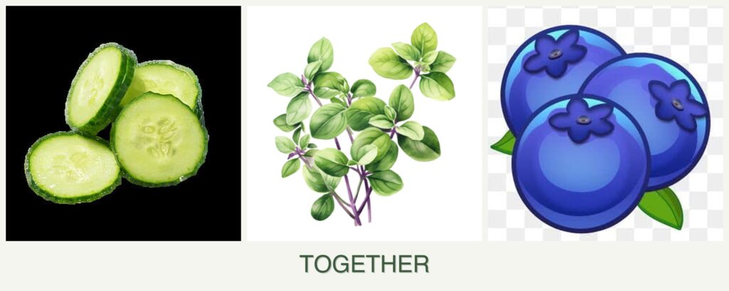 - Growth Requirements: Cucumbers require full sun and plenty of water. Oregano prefers dry conditions and well-drained soil. Blueberries need acidic soil with good drainage and moderate watering.