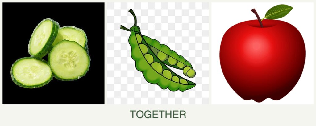 - Growth Requirements: Cucumbers and peas have similar sunlight and soil needs, while apple trees require more space and different soil conditions.