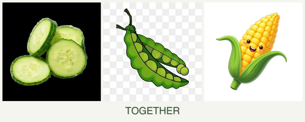 Peas enrich the soil with nitrogen, which supports the growth of cucumbers and corn. However, these plants should not compete for the same nutrients, so proper spacing is essential.