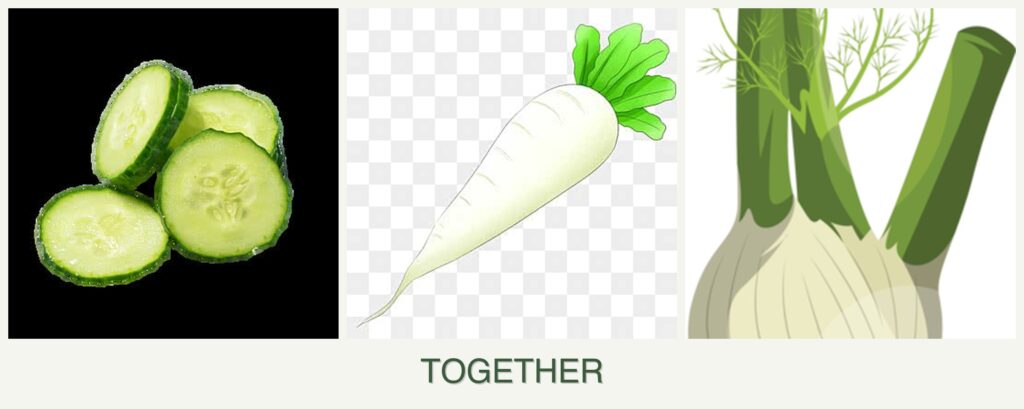 - Timing: Plant radishes early in the spring and cucumbers after the last frost. Fennel can be planted after the risk of frost has passed.