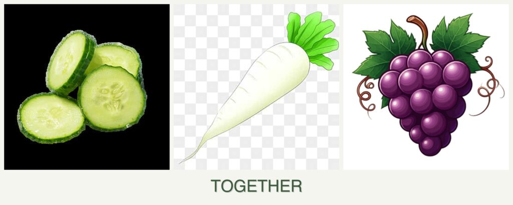 - Pest Control: Radishes can deter cucumber beetles, benefiting cucumbers. Grapes do not attract pests that harm cucumbers or radishes.