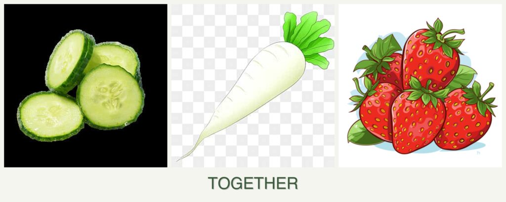 Spacing: Cucumbers need space to spread, radishes grow quickly and can be harvested early, making room for cucumbers. Strawberries require space to expand, but their shallow roots can coexist with deeper-rooted plants.
