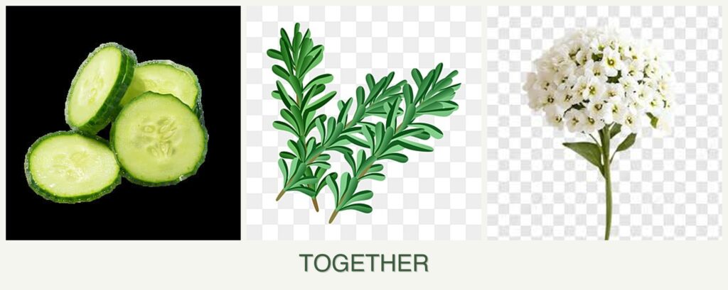 - Growth Requirements: Cucumbers need ample water and space, rosemary prefers dry conditions, and alyssum adapts well to various environments.