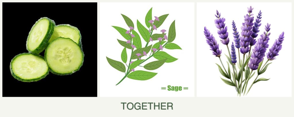 - Harvesting Considerations: Cucumbers’ vining habit may interfere with harvesting sage and lavender.