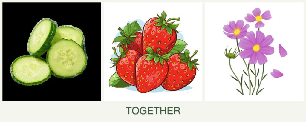 Key Factors: All three plants enjoy full sun, making them compatible in terms of light requirements. Strawberries and cucumbers benefit from the pest-repellent properties of cosmos, while cosmos attracts pollinators that can improve the fruit set of strawberries and cucumbers.