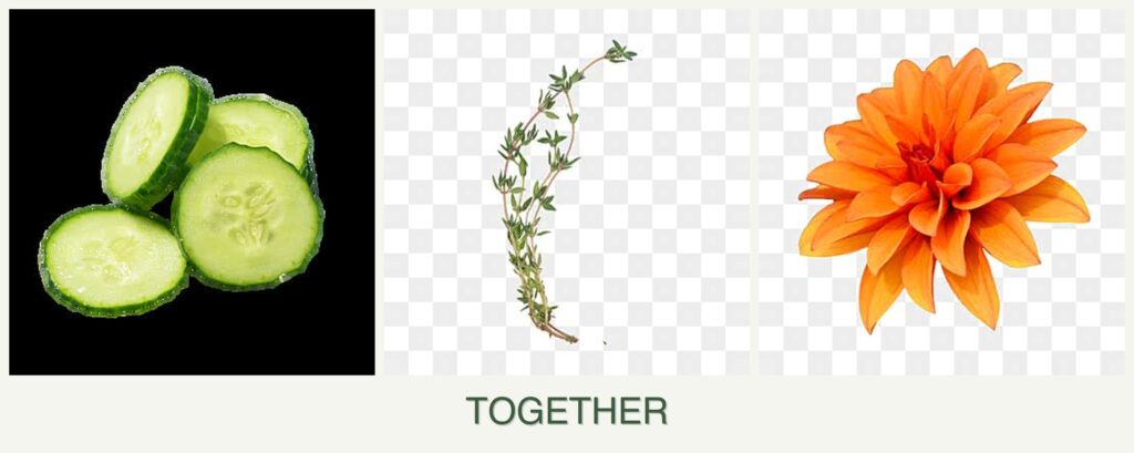 When is the best time to plant these together? Plant after the last frost for cucumbers and dahlias; thyme can be planted earlier or at the same time.