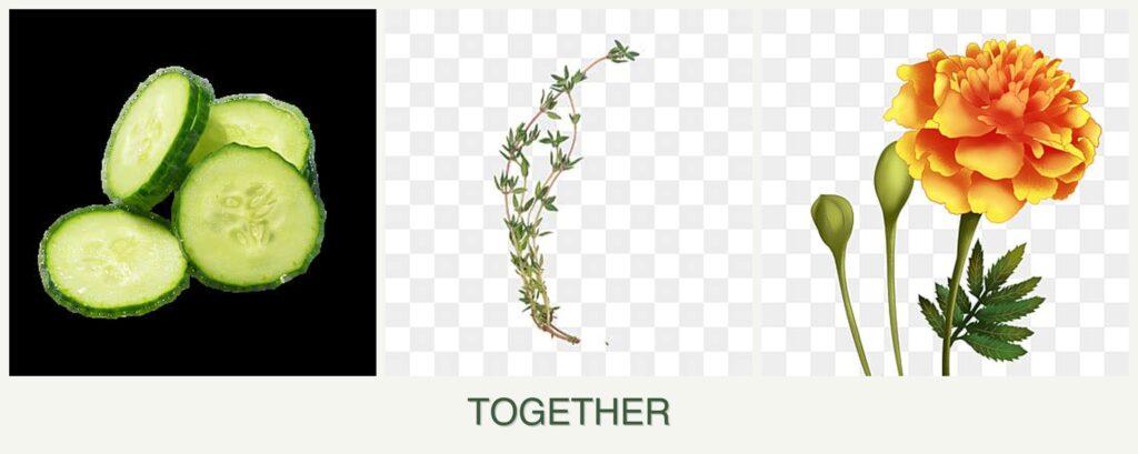 Planting cucumbers, thyme, and marigolds together offers several benefits: