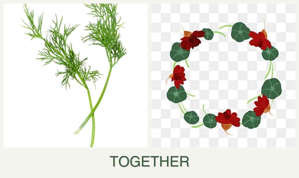 - Space Efficiency: Nasturtiums’ trailing habit can cover ground beneath taller dill plants, maximizing garden space.