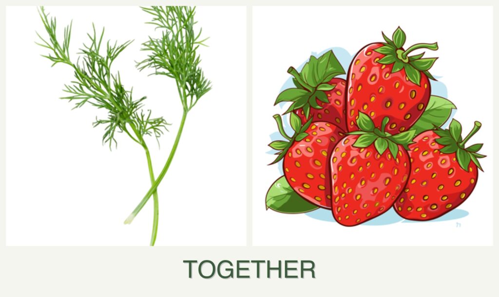 - Timing: Plant strawberries in early spring and dill after the last frost.