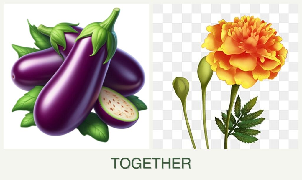 Eggplants should be 18-24 inches apart, while marigolds can be planted 6-12 inches apart, depending on the variety.