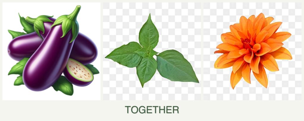 - Growth Requirements: Eggplant and basil thrive in similar conditions, needing full sun and well-drained soil. Dahlias also prefer full sun but may require more water.