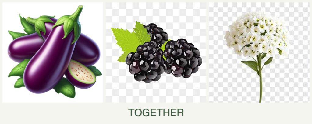 Growth Requirements: Eggplants thrive in full sun and need warm temperatures, while blackberries prefer slightly cooler conditions but can tolerate full sun. Alyssum, a low-growing flower, can adapt to various conditions and acts as a ground cover.