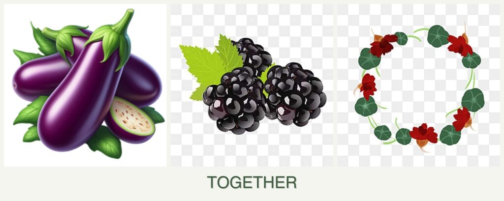 These plants can work together if their environmental needs are balanced, with nasturtiums acting as a natural pest deterrent and eggplant and blackberries providing structural diversity.