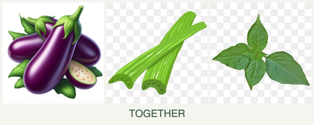 - Growth Requirements: Eggplant and basil both prefer full sun, while celery can tolerate partial shade.