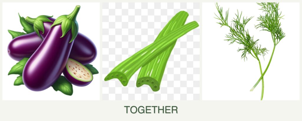 - Space Efficiency: Dill’s tall, feathery growth can fit into spaces between eggplant and celery without competing for ground space.