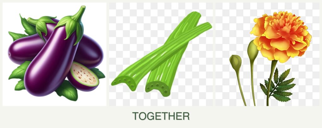 Planting eggplant, celery, and marigolds together offers several advantages: