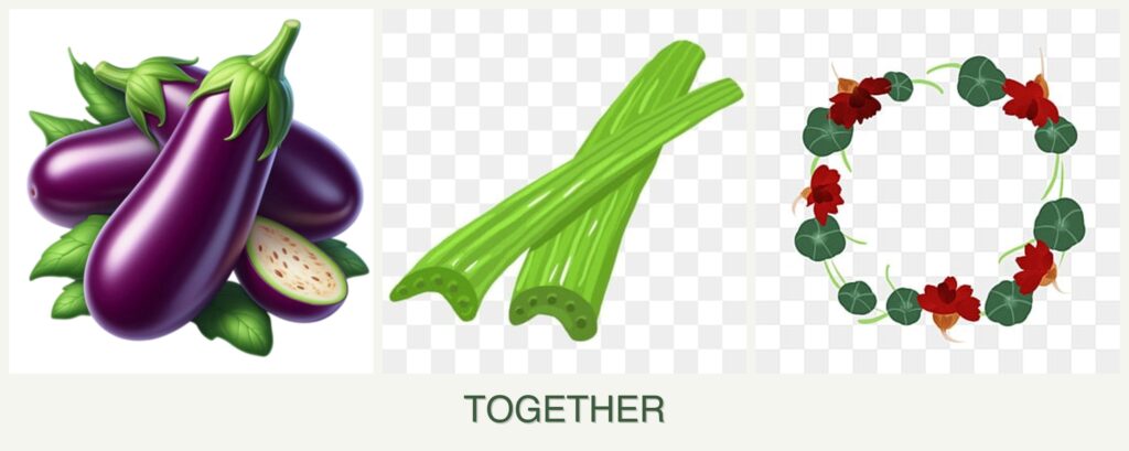 Growth Requirements: Eggplants and celery both prefer full sun, while nasturtiums can tolerate partial shade, making them versatile companions. They have similar watering needs, although celery requires more consistent moisture.