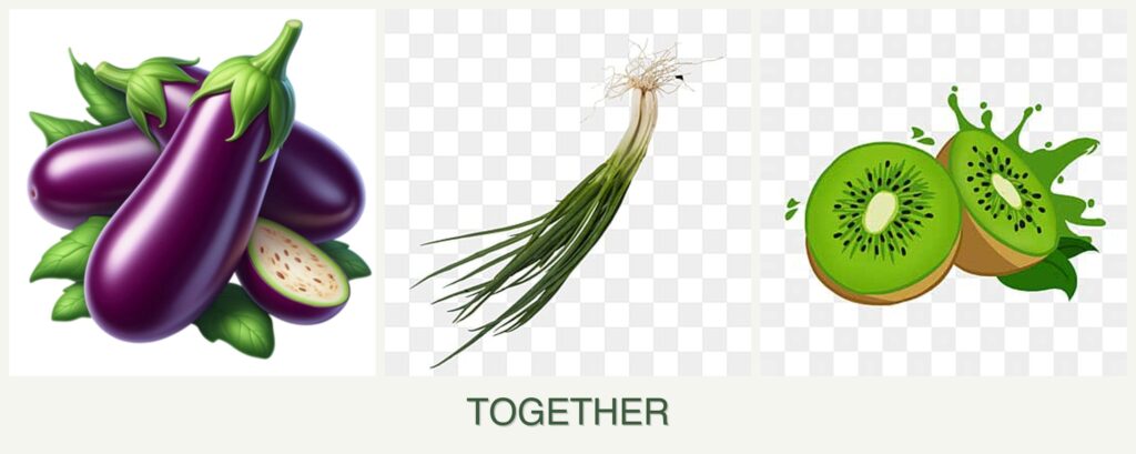 Eggplants thrive in warm temperatures with plenty of sunlight, while chives are more adaptable and can tolerate partial shade. Both enjoy well-drained soil and can benefit from each other’s pest-repellent properties. However, kiwi is a vigorous vine that requires a lot of space, a sturdy support system, and specific climatic conditions that differ from those needed by eggplant and chives. Kiwi’s extensive root system and need for ample water could overshadow the requirements of the other two plants, making them less compatible as companion plants.