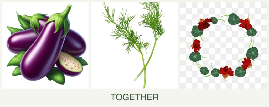 - Pest Repellent Properties: Dill attracts beneficial insects, and nasturtiums serve as a trap crop, protecting eggplants from common pests.