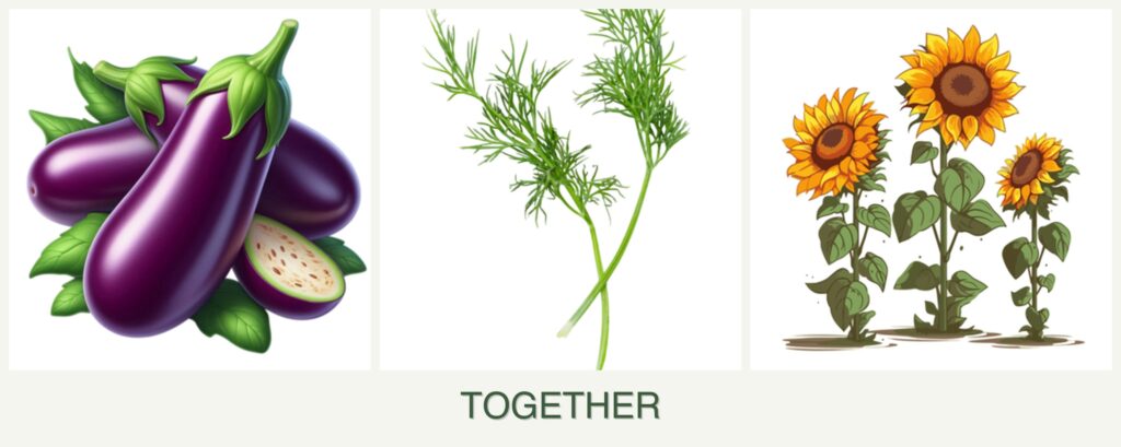 Pest Repellent Properties: Dill attracts beneficial insects, providing natural pest control for eggplants. Sunflowers can divert pests like aphids.