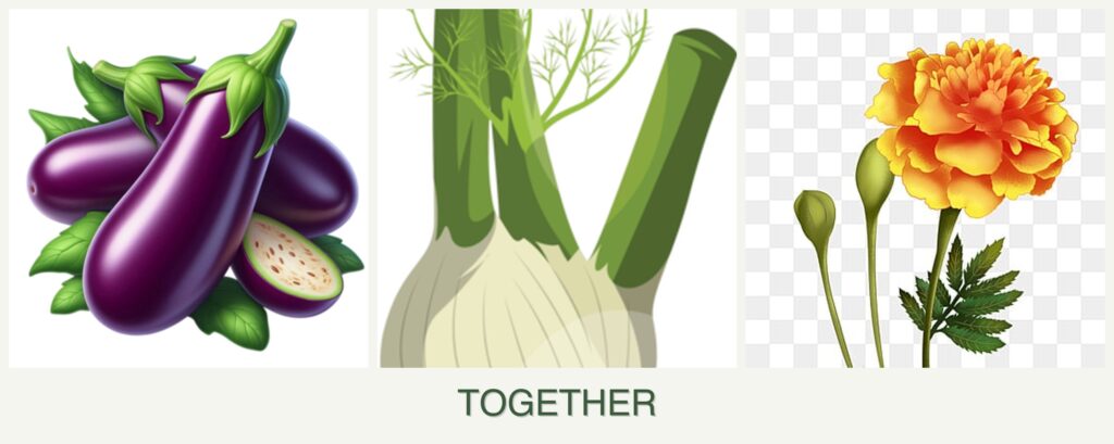 - Pest Control: Marigolds are known for repelling nematodes and other pests, benefiting eggplants. Fennel attracts beneficial insects like ladybugs and parasitic wasps, which can help control pests naturally.
