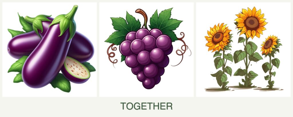 Harvesting Considerations: Grapes and sunflowers can grow quite tall, potentially overshadowing eggplants and complicating harvesting.