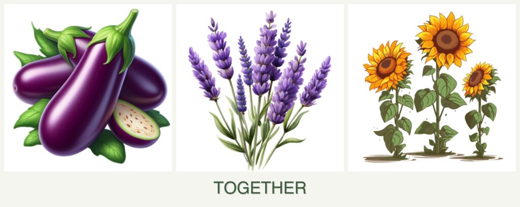 - Growth Requirements: Eggplants need warm, sunny conditions, similar to sunflowers, while lavender prefers well-drained soil.